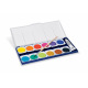 Coffret Staedtler Noris Club de 12 pastilles d'aquarelle, un tube de gouache blanche et un pinceau. Pratique de par son couvercle-palette qui peut servir pour le mélange des couleurs. Toutes les couleurs peuvent être mélangées entre elles. Couleurs brillantes avec excellent pouvoir couvrant. Boîte de 12 godets interchangeables.