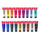 102 kleuren in tubes van 20 ml of 120 ml. 90 kleuren in potten van 500 ml.