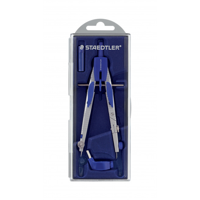 Staedtler 553 passer met verstelknoppen en centrale micrometer schroef in plastic. Voorzien van een drukknopmechanisme, centreerwiel en been met scharnier.