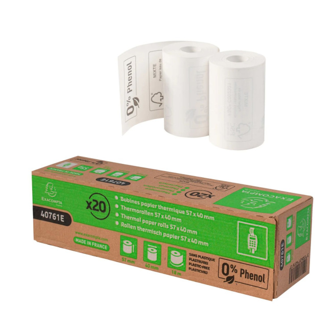Exacompta thermische rekenrollen zonder fenol en zero plastic voor het afdrukken van kassabonnen en bankterminalbewijzen.