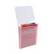 Buitenkant van zeer stevig transparant polypropyleen met een dikte van 1000 micron. Binnenste scheidingswanden van meerkleurig polypropyleen met een dikte van 200 micron. Sluiting door een klep met inkeping.